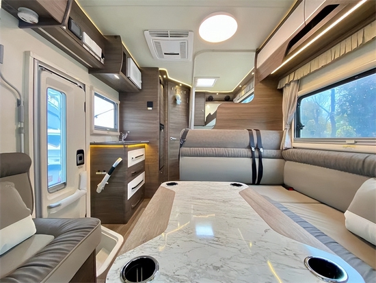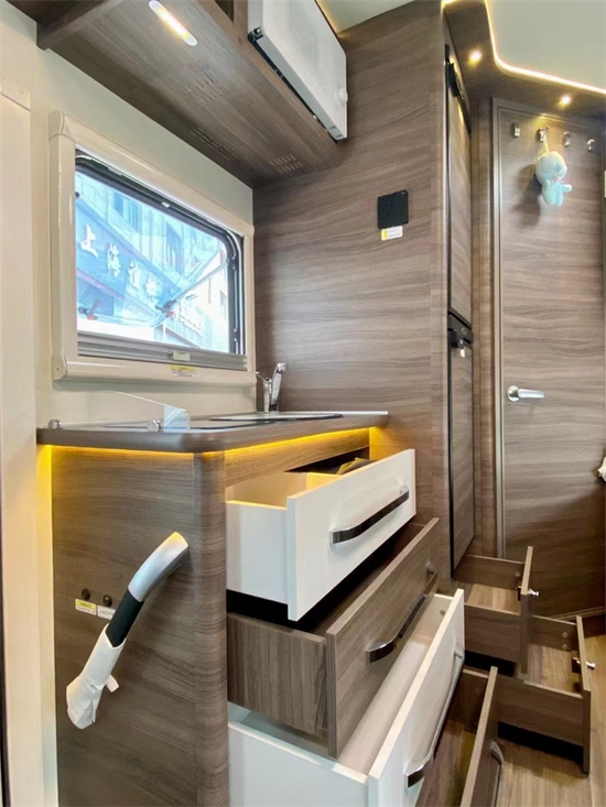 车内饰进口特鲁马暖风热水一体机静音,环保效率高,英特尔152升的冰箱可以自由地调节温度。卫生间的区域用的是进口赛特福德,可旋转式的马桶,同时,配有陶瓷的洗手盆,冷热花洒,排气扇等等。