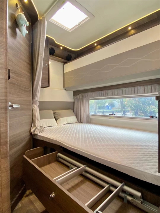 在休息区域,后面采用的是纵置的子母床,下床为一米2×1米九的双人床,可供两人休息上床为0.8米,乘以一米九的床铺可以翻折。而且上下床分别采用宽幅采光推拉窗,透气,采光效果更好。