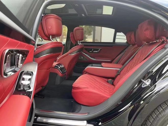 22款奔驰S500 配置:金属漆,专属Napa真皮座椅(红色菱形格) ,黑色鹿皮顶,21寸AMG V-型多幅轮毂(方向盘加热,后排电动调节,座椅记忆,后排座椅加热,主动通风,前后排中央扶手加热,门板扶手加热),钢琴漆拉丝内饰后轮4.5度转向主动氛围灯,黑色虚线装饰中央扶手箱,轮毂锁,急救包,前排MBUX内部辅助,高性能降噪轮胎,3.0直列6缸涡轮增压48V轻混发动机,前排带按摩功能多轮廓座椅,前排座椅腰部支撑调节,电动后窗遮阳帘,联系电话:18812637416刘经理 (同号微信)12.3寸液晶仪表盘,12.8寸中控OLED触摸屏,主动氛围灯,门槛饰板发光,无钥匙进入,无痕门把手,电吸门,防紫外线玻璃,全景天窗,实景导航,环影,无线充电,无线电话集成,苹果carplay,安卓汽车,的前LED奔驰LOGO,柏林之声环绕3D音响,客舱空气平衡香氛系统,加强气囊系统(第二排气囊),主动刹车系统,注意力集中系统,主动车道保持,碰撞预警系统,盲点系统,LED主动大灯系统,主动停车辅助,雷达测距
