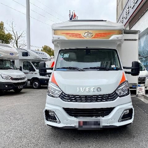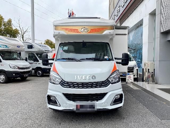 外观上,以奶白色为底色,搭配红金拉花点缀,大气典雅。车身前脸拥有金冠专属的运动包围保险杠,美观实用,可将行驶过程中的空气阻力充分导流至车身两侧,相比较之前依维柯的车型前脸,更添运动气息。车身右侧功能齐备,装置有洗衣机、水路过滤器+低噪水泵、外置冷热调节淋浴、外接电源插座、户外抽拉式燃气灶、气罐舱(带安全阀)、室外餐板、电动踏步、多美达遮阳篷、整车门锁、超大贯通式储物舱等。