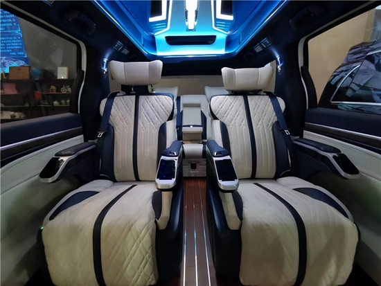 进入乘客舱,两张超大的独立航空座椅映入眼帘,座椅通风、加热、按摩、头枕、腿托调节功能一应俱全。座椅采用手工纳帕真皮包覆,艺术菱形打孔,奢华感满满。极夜之光版车顶流线感十足配上星空顶十分美丽,宛如在冰岛欣赏极光之美。地板采用的是南美进口的柚木手工地板逼格满满。
