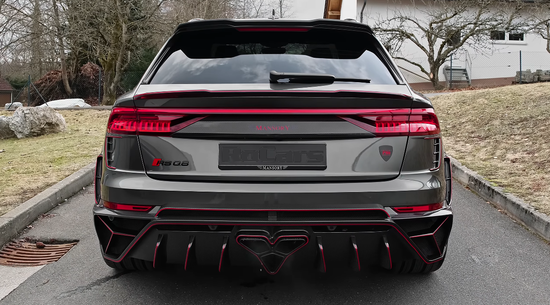 在MANSORY迈莎锐的加持下,奥迪RSQ8带上战斗气息十足的运动套组,引擎爱上醒目的进气口在碳纤维的作用下气焰嚣张,标志性多边形格栅视觉效果更为丰富,前脸大部分区域都被改装“黄金”碳纤维重新打造,而在前唇在导气槽还有中网部分我们看见了热情洋溢的红色线条,红与黑灰之间的搭配和谐经典,让整车更加凶猛。