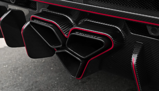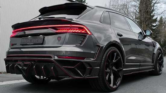 在车尾部分,碳纤维也被使用的非常彻底,在空气套件的加入下,浑身带碳的奥迪RSQ8展现出特有的魅力,而那尺寸不容忽视的外包围在红色线条的勾勒下,显示出霸道的气势,中间部位的排气管设计标新立异,对整车强悍的运动气质再次呼应。