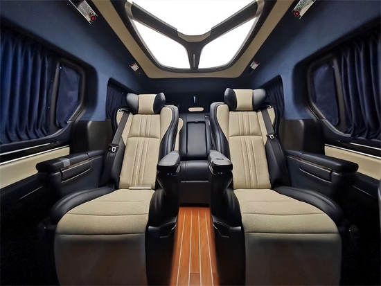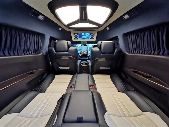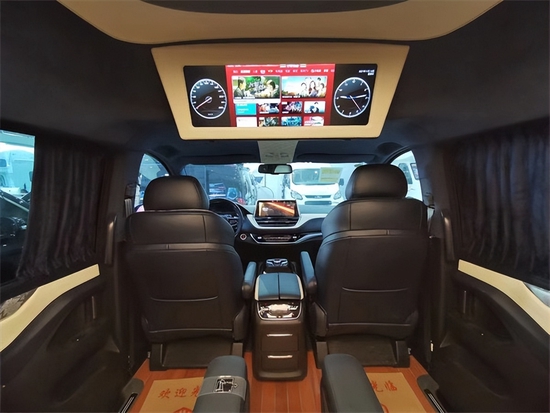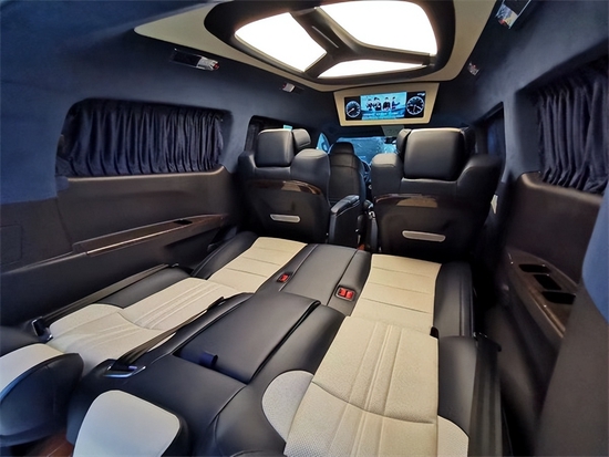 车内顶部为采用的是麂皮绒的软包加上星盾天幕顶灯,除了这些基本的功能性以外,整车在看不到的地方,比如四周全部做了隔音的处理,窗户上都加装的是高级私密窗帘,既可以避免阳光的直接照射,维护车内的一个用车环境,也可以很好的保护我们车主的隐私。