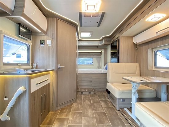 整车前左侧为4人对坐沙发、右侧为厨房区域、中部为卫生间,尾部为横置双人床铺,布局人性合理,整体可实现6乘6卧,符合国人生活惯,可容纳多种生活方式。前额部分设有固定大床,尺寸为:1170×2100(mm),空高650,配有透气大天窗,睡眠空间不逼仄。 床板部分可翻折,下方为32寸高清液晶电视。双向拓展可以给车内带来更大的空间,左侧可向外拓展600×2600(mm),尾部向后拓展后可将尾床加宽加大,为客户提供一张2000×1250(mm)固定双人床,将合理空间有效利用。