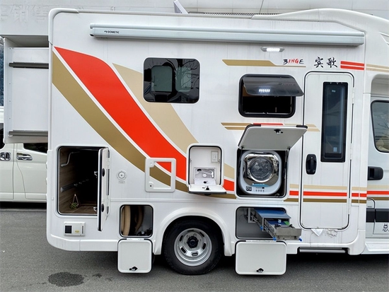 整车采用全铝合金骨架,比传统箱体轻10%,结构采用拉铆工艺,强度可靠。车身右侧功能齐备,装置有洗衣机、水路过滤器+低噪水泵、外置冷热调节淋浴、外接电源插座、户外抽拉式燃气灶、气罐舱(带安全阀)、室外餐板、电动踏步、多美达遮阳篷、整车门锁、超大贯通式储物舱等。尾部的大力支腿,能保证车辆停驻时不摇晃不抖动,让车身稳定,如履平地。