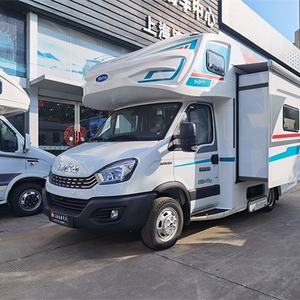 车身内饰全新设计,无论质感还是观感都有所突破,以咖啡色与白色搭配营造氛围,木质纹理与白色烤漆相间呼应,用料做工及配色方案无不突出高端二字。驾驶室上方额头双人床的设计,尺寸为2200×1500(mm),通过室内爬梯可上下往返,还是比较便利的。对卡座区域,全新皮质座椅,软包车窗四周,白色烤漆曲面柜。搭配一张可拆卸的餐桌,临时可拼成一张尺寸为1900×900(mm)的沙发床。