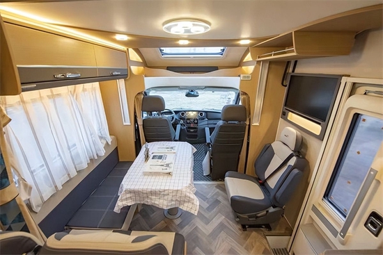 进入车厢,不得不说这款房车内饰设计和配色着实让人眼前一亮,既温馨又有质感。虽然这款房车没有拓展机构,但内部整体空间表现中规中矩,不算宽敞,但绝对够用。因为是小额头房车,所以并没有额头床,取而代之的是大尺寸天窗和储物格,此外还有一台29寸液晶电视。会客区采用了L形沙发+单人座椅+升降餐桌的布局,座椅采用了符合人体工程学的沙发座椅,支撑性更好,保证了长途旅行乘坐的舒适性。