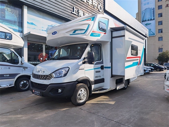 车身内饰全新设计,无论质感还是观感都有所突破,以咖啡色与白色搭配营造氛围,木质纹理与白色烤漆相间呼应,用料做工及配色方案无不突出高端二字。驾驶室上方额头双人床的设计,尺寸为2200×1500(mm),通过室内爬梯可上下往返,还是比较便利的。对卡座区域,全新皮质座椅,软包车窗四周,白色烤漆曲面柜。搭配一张可拆卸的餐桌,临时可拼成一张尺寸为1900×900(mm)的沙发床。