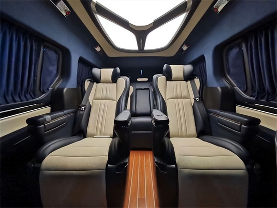 车内顶部为采用的是麂皮绒的软包加上星盾天幕顶灯,除了这些基本的功能性以外,整车在看不到的地方,比如四周全部做了隔音的处理,窗户上都加装的是高级私密窗帘,既可以避免阳光的直接照射,维护车内的一个用车环境,也可以很好的保护我们车主的隐私。
