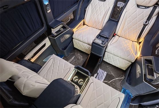 这款奔驰V260的贵宾舱采用的是两两对坐的商务洽谈格局设计,在大尺寸的液晶电视下方,奔驰V260配置了两个可折叠的秘书座椅,可一键电动展开。在两张秘书座椅的中间,是一个小型车内吧台,内置胶囊式咖啡机和一个折叠小桌台,最大限度的利用车内空间,折叠小桌台也可以给车内的商务人士提供一个处理文件以及与客户洽谈的平台。