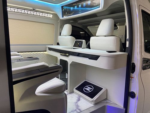 2022丰田7座海狮 2022款丰田海狮蓝牌C本多少钱丰田海狮皇冠版七座大型商务接待用车,车长五米915,宽一米九五,实测高度两米二,搭载的是3.5V6汽油版的发动机,皇冠的标识电动中门一键开启,车内两张阿尔法原装进口座椅,中间这个过道的宽度还是可以的,能过个人最起码后方这一块儿的空间特特别大啊。后方三连座椅放倒之后是一张床的状态,顶部有星空顶氛围灯,支持多种颜色渐变,前方还有一块超大的显示屏幕,支持播放电影,播放音乐。把它打开给大家看一下啊。这里还有一个小吧台,下方保温壶电视正在开启,华为的。