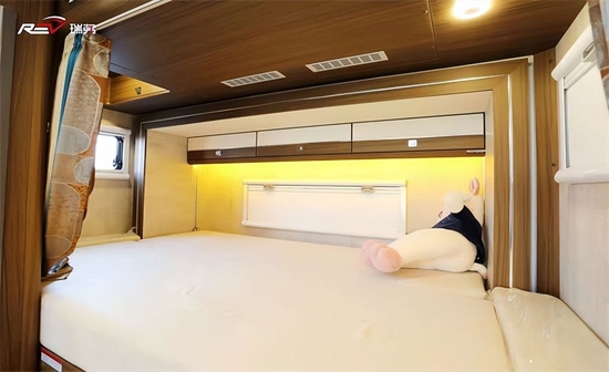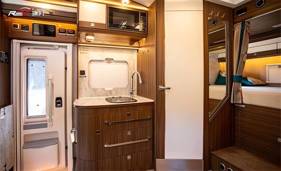 厨房区在这一代新车上最大的变化是取消了固定电磁炉,改为移动式电磁炉,方便在车外使用。新增了额外的翻折桌板,架起了中门和厨台之间的桥梁,可利用空间增大。带盖板的洗菜池,顶部吊柜以及微波炉等都是该车的标配。
