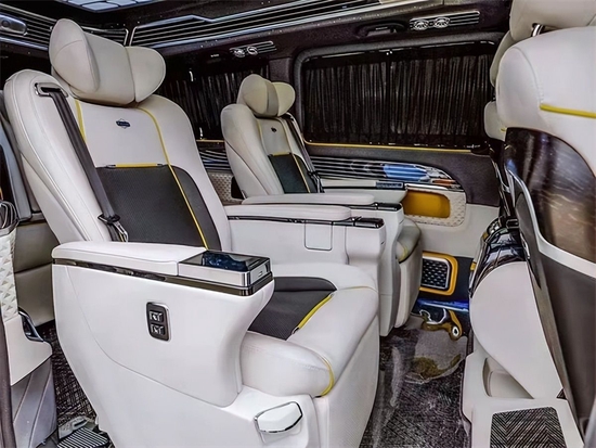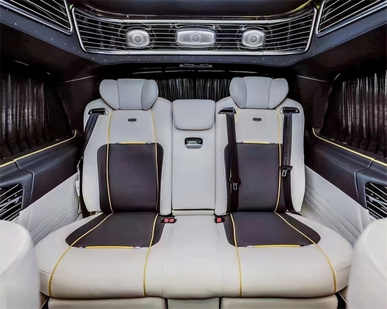 该车采用2+2+3七座格局,乘客舱中最引人瞩目的当属中排两张头等舱级航空电动按摩座椅,座椅由Nappa打孔真皮包覆,扶手两端有隐形杯托以及隐形控制面板(加热通风 、气动按摩、腿托、水平旋转、前后移动等多种人性化功能)。