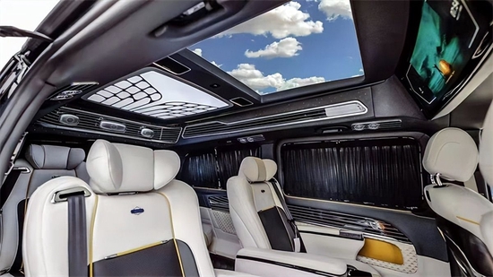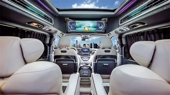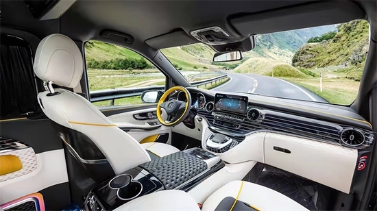 前脸采用超大开口的直瀑式中网,大面积的镀铬装饰,中网之中还有抽象的奔驰星徽更加的别致;艺术造型的下示廓灯,有效地给对向车辆提供准确的信号,还更加的美观。气场盖过丰田埃尔法和雷克萨斯LM300。鹰眼式的LED大灯目露霸气,智能调节水平高低,自动根据环境明亮开启,保障你的夜间出行。配备了S级才配备的空气悬挂,双五辐的旋风轮毂更加轻盈与众不同,舒适度堪比奔驰S级。