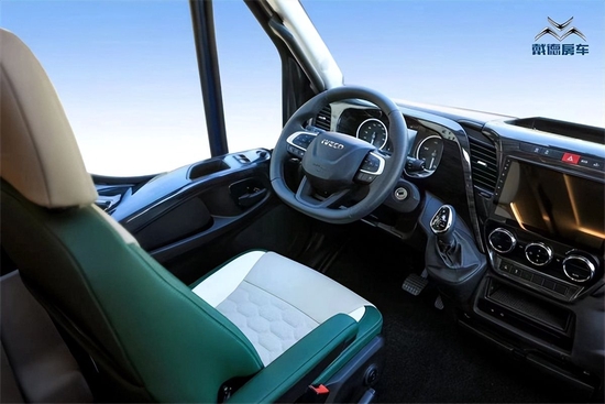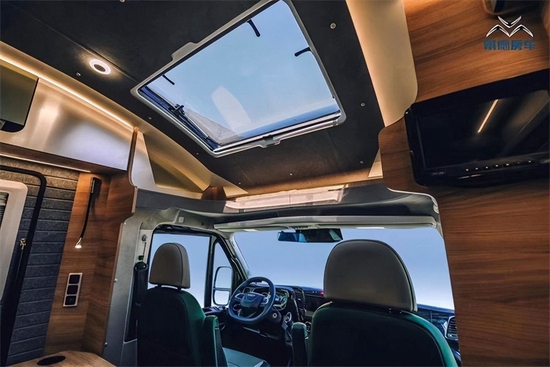 驾驶室往后是车内会客区的位置,高配版车型奢侈的设置了两个航空座椅,带通风、加热、记忆、按摩、电动脚托等多项功能,舒适度绝对是一流的。座椅侧面就是前面提到的开放式车舱,行车时小窗观景,露营时直接上大窗,要的就是惬意的感觉。座椅上方配有一台1.5P的FUJISHU变频空调,有着静音省电的优势。