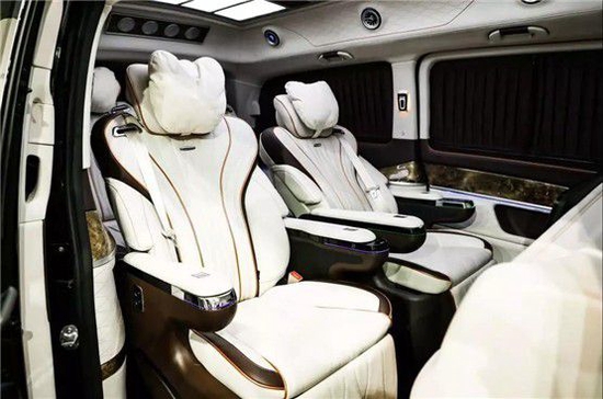 奔驰高顶商务车圣母峰全舱所有座椅都采用了意大利头层的nappa牛皮包裹,并搭配菱形锋线打孔设计,无论是双手抚摸上去的细感还是乘坐舒适度均有保证。