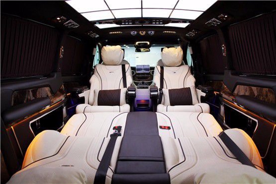 奔驰高顶商务车圣母峰车顶采用大面积的LED顶灯,保证了车内的充足照明,后舱玻璃处均配备了隐私窗帘,不用担心受到外界环境的打扰,一个车内的独立小空间就这样诞生了。
