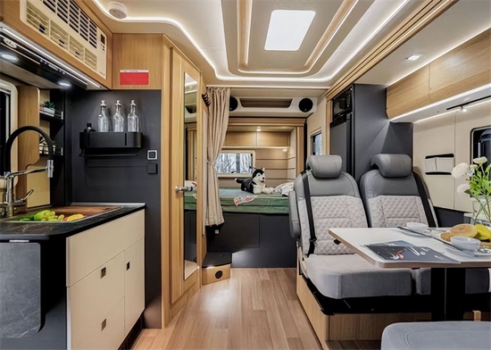 宇通C535旗舰版双拓展房车是基于依维柯底盘打造,搭载3.0T柴油发动机,匹配8AT自动挡变速箱。它的车身长5.99米,宽2.53,高3.21米, C 照即可驾驶;高端外观,采用红蓝白大气配色,简约优雅;6座6卧超大空间,满足多人居住,待在车里使人悠然自得。二、首先进入我们的宇通C535旗舰版双拓展房车里面,可以看到里面的品质内饰;布艺加皮革包覆正副司机椅,驾驶区有脚垫,布艺加皮革面料包覆双人对坐商务椅,气动升降式餐桌可四向滑移,前后床位私密拉帘,驾驶室私密拉帘,驾驶区上部双人床且有床垫加上后部横置双人床;宇通耗资1000余万建设整车标准环境舱购置甲醛等挥发性有机物环保检验设备,构建了严格完善的空气质量监控体系建立了从原材料到整车的环保控制技术形成独有的宇通房车3AOS环保管控体系,打造母婴级标准健康环保房车。