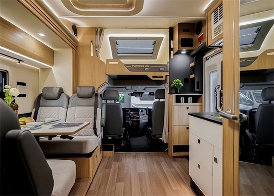 宇通C530大玩家定制版车内餐厨区,采用集成化设计,并标配有电磁炉、不锈钢洗菜池、厨具储物柜、独立储物柜、房车专用冰箱、通风窗、置物架、5孔电源插座以及水龙头和一个饮用水水龙头。冰箱可选国产或进口型的85-152L容量冰箱。宇通C535双拓展旗舰版的餐厨区配置有新型三合一水龙头、沥水栏、房车专用超大容量冰箱、微波炉,将之前的电磁炉从固定式改为移动式,并在橱柜上增加了延长板,可以增大橱柜台面的操作面积,方便制作出更多美味佳肴,为户外旅居的烹饪生活带来更美好的体验及便利。