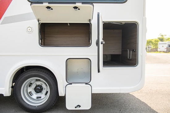 车侧配置丰富,配有15米外接电源插座、3m x 2.5m手动遮阳篷、外置220V电源五孔插座、外置冷热水出口、双层真空亚克力外推窗、正副驾驶上车踏步、电动上车踏步+报警系统、室外餐板、超大贯通式储物舱等,满足车主户外出行的多种需求。