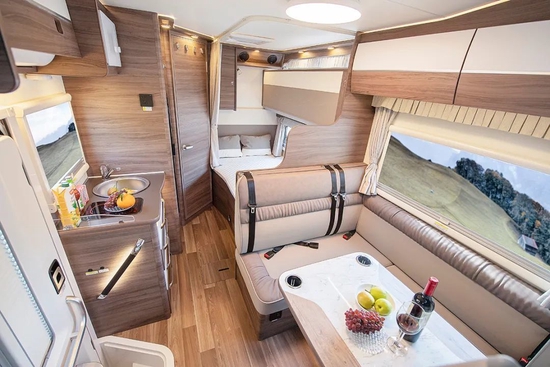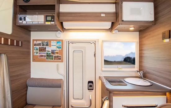 新车内部设计采用浅木色加米白的配色,温馨精致。家具采用E0级轻质环保板材+高级皮料,更添高级质感。布局清晰,前方为驾驶室、额头床,中部为会客区、厨房区,尾部为休息区、卫生间区域。