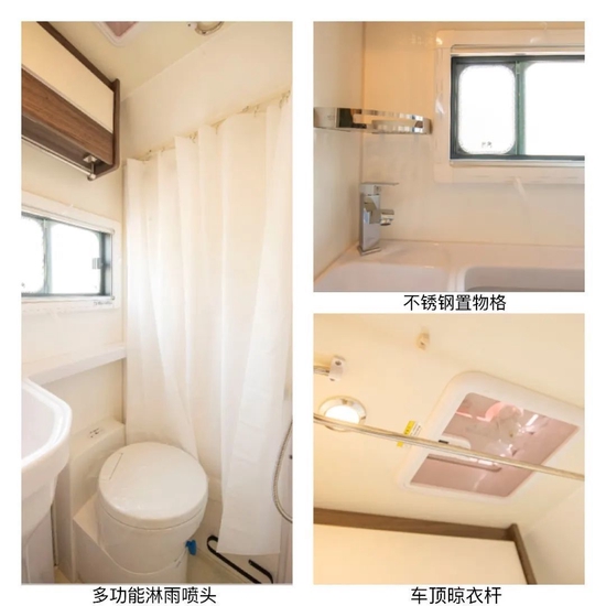即使是“隐蔽”的卫生间区域,同样彰显不凡品质。卫浴采用SMC复合材料打造的整体式卫浴,具有耐水防霉,寿命长的优点。卫生间内部配备有顶置双向换气扇+可收折晾衣杆+拖鞋架、下沉一体式洗水盆、淋浴喷头、18L盒式马桶、柴油暖风热水器系统等。