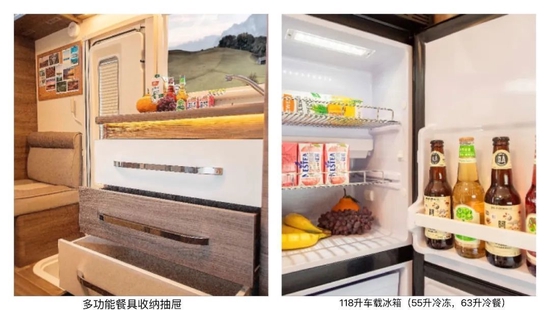 在厨房一侧,还配有118L车载冰箱,可供冷藏或者冷冻食物。宾歌T10特别纪念款与宾歌其他车型选用同规格整体式卫生间,同时优化配置,增加多功能淋雨喷头,顶置晾衣杆,拖鞋沥水架等实用装置。