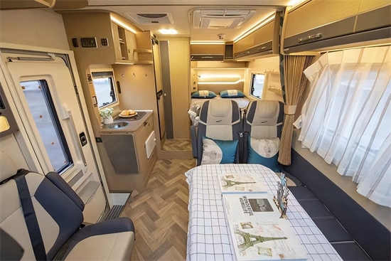 进入车厢,不得不说这款房车内饰设计和配色着实让人眼前一亮,既温馨又有质感。虽然这款房车没有拓展机构,但内部整体空间表现中规中矩,不算宽敞,但绝对够用。因为是小额头房车,所以并没有额头床,取而代之的是大尺寸天窗和储物格,此外还有一台29寸液晶电视。会客区采用了L形沙发+单人座椅+升降餐桌的布局,座椅采用了符合人体工程学的沙发座椅,支撑性更好,保证了长途旅行乘坐的舒适性。