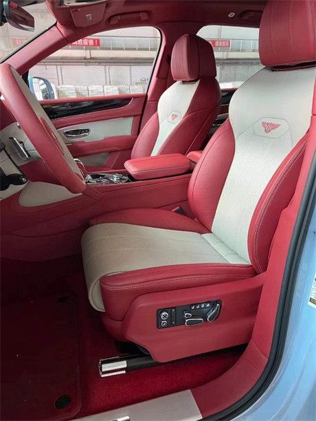 2021款宾利添越绚蓝/亚麻白配热刺红配置:金属漆,颜色包,前排舒适座椅包,黑色钢琴内饰板,撞色缝线,21寸轮毂,加热双色方向盘,刺绣宾利徽章,氛围灯。