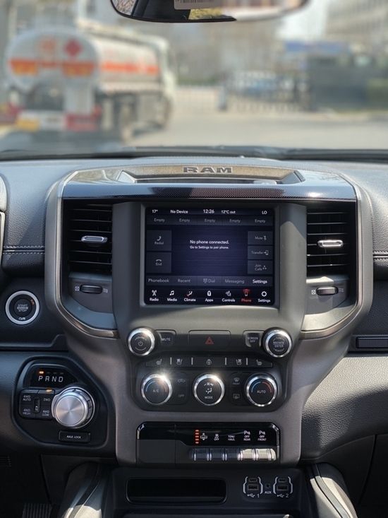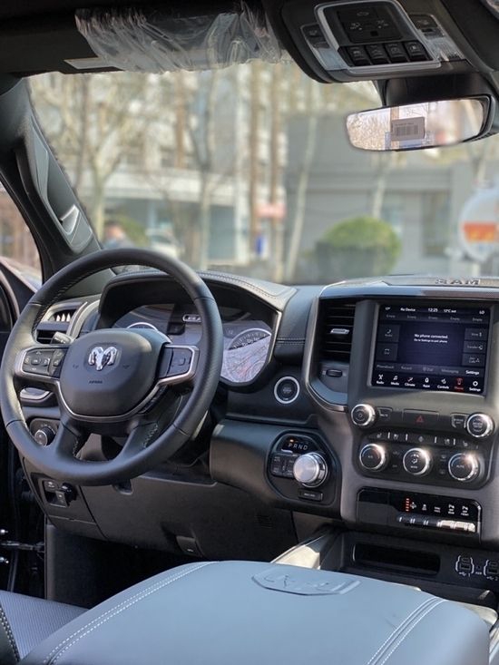 道奇公羊内部设计上还是延续了美式那种比较粗犷的风格,规整的中控台设计看上去比较死板,但丰富的配置会让你不由得为其称赞,中控台的设计简洁硬派,符合公羊的气质,仪表盘底边有花纹,则更加凸显了这款车的文雅性,软性材质的仪表台设计,摸上去手感非常舒服,并无些许生硬之处。