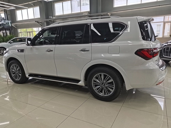 22款国六加版英菲尼迪QX80高配侧面的造型,因为属于中期改款,基本没有什么变化,依旧保持硬朗的造型,前后侧翼子板微微突出车身,搭配车门下方外凸的脚踏板,再加上大尺寸轮毂,看上去四平八稳。