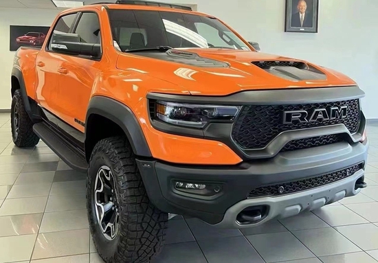 22款道奇公羊霸王龙6.2V8机械增压,710马力扭矩880,新款霸王龙家族高大威猛的造型设计,同时细节部分融入了更多高性能元素,包括经过黑化处理的前格栅,引擎盖两侧的黑色进气口,以及为了容纳巨大的机械增压器而设计的通风口等,新车还配备了视觉冲击力更强的黑色轮眉和外露式的拖车钩,看上去十分霸气。道奇公羊1500现车销售22款6.2V8 TRX霸王龙销售电话在下方。
