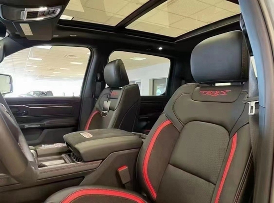 22款全新道奇公羊霸王龙内饰部分进一步强化了其高性能版本的形象,中控台和座椅随处可见的TRX标识便是最好的例证。同时,作为道奇Ram 家族的旗舰车型,新车还配备了12英寸竖置中控屏幕,除了支持蓝牙、导航和车载Wi-Fi等常见功能,还支持Apple CarPlay和Android Auto手机映射。
