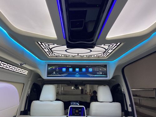 2022丰田7座海狮 2022款丰田海狮蓝牌C本多少钱丰田海狮皇冠版七座大型商务接待用车,车长五米915,宽一米九五,实测高度两米二,搭载的是3.5V6汽油版的发动机,皇冠的标识电动中门一键开启,车内两张阿尔法原装进口座椅,中间这个过道的宽度还是可以的,能过个人最起码后方这一块儿的空间特特别大啊。后方三连座椅放倒之后是一张床的状态,顶部有星空顶氛围灯,支持多种颜色渐变,前方还有一块超大的显示屏幕,支持播放电影,播放音乐。把它打开给大家看一下啊。这里还有一个小吧台,下方保温壶电视正在开启,华为的。
