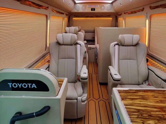 在外观的华通丰业设计上与其他车系的设计并无太大的差距,米黄金色的车身设计,闪亮的颜色突出高贵的色彩,彩色的中线,华通丰业突出丰田考斯特改装商务车的层次感并且不会因车身颜色的单一而显得过于单调。车门处大的电动台阶大的设置,为上下车提供方便。而贴心也成为华通丰业丰田考斯特改装商务车的一大特色。