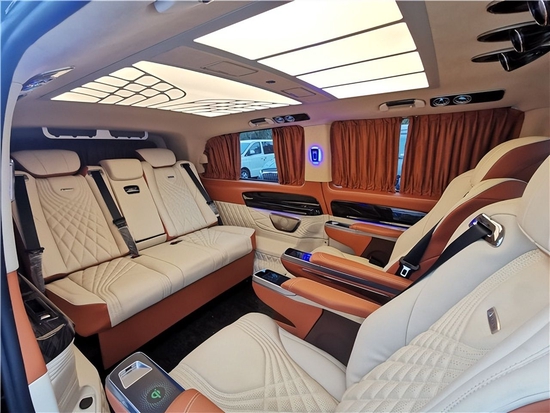 奔驰威霆改装商务车的第三排座椅为标准的电动沙发座椅,可以通过隐藏在靠背中部扶手上的控制屏对座椅的靠背、底部的滑轨进行控制调节,必要时可以完全放平,形成一张豪华双人大床。改装后奔驰威霆的第三排座椅为标准的电动沙发座椅,可以通过隐藏在靠背中部扶手上的控制屏对座椅的靠背、腿托进行控制调节,必要时可以完全放平,形成一张豪华双人大床。改装后奔驰威霆在其绝佳的空间设计,让商务出行更加舒适放松,可调整的座椅设计能根据实际需求灵活改变,满足各种类型的使用需求。