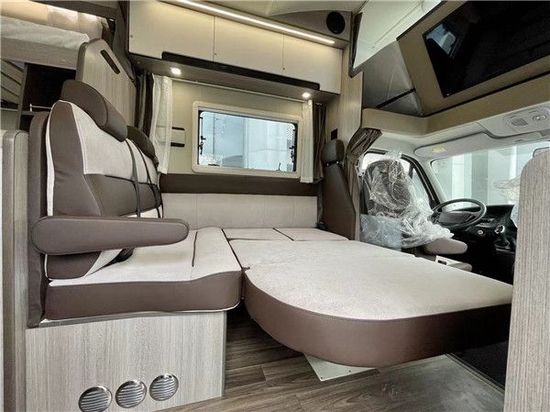 步入车内,科技灰环保板材与米白色软式搭配,为车内营造出居家般生活空间,使用空间虽小但L型卡座会客区、前额头床、中央厨房、后子母床(或者后纵床)及一体式卫生间功能全部都有。整车前后床铺、驾驶室、L型沙发卡座客椅左侧以及后床铺左侧均配备有私密拉帘,有效保障旅途中的隐私。---180---1775---1185