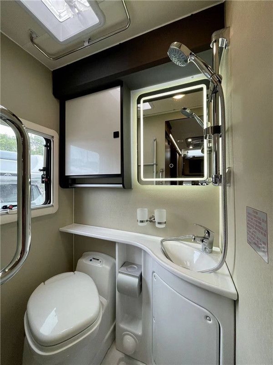 卫生间的空间还是不错的,可以满足一个成年人的正常洗漱。配置也基本齐全,主要有便携式马桶、淋浴花洒、置物架、毛巾架、梳妆镜以及顶部的换气扇。但未配置洗脸盆,这个可以支持选装。毕竟这是一款宇通房车打造的房车,可以享受宇通优质的售后服务。目前这款房车的官方指导价为39.8万,并且目前会赠送原厂800AH锂电池。