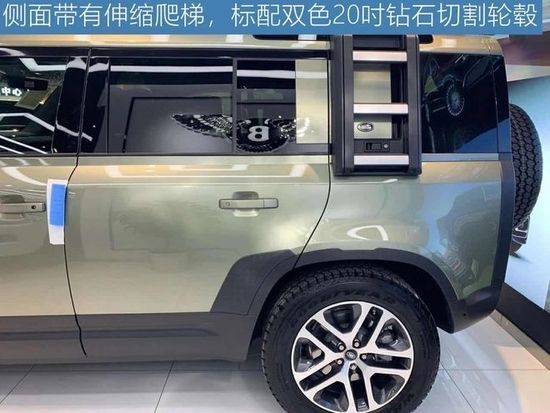 2022款路虎卫士侧面的造型更有辨识度, 线条十分硬朗又不失圆润。在接车尾的地方,有一个伸缩爬梯,上下车顶行李架取放物品也更加方便。酷黑特别版车型也是全系车型中唯一标配双色20吋钻石切割轮毂的车型,其余车型全部需要选装。