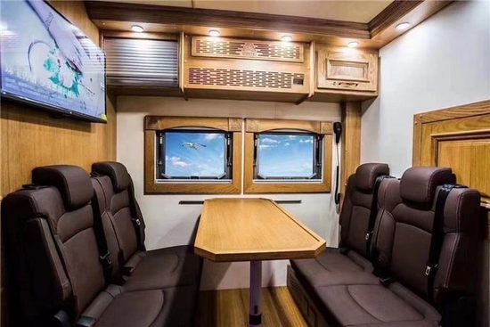 会客区真皮软包对卡座沙发满足4人乘坐,卡座沙发搭配气动升降餐桌可变为一张沙发床;固定式安全带保护行车途中乘客的人身安全。坐垫厚实,弧形靠背也提供一定的支持感,整体来说乘坐舒适感还是不错的;沙发内侧墙壁2个独立外推窗,提供采光及通风换气效果;三菱重工变频空调(单冷)制冷效果快,可手动调节温度;吊柜方便日常收纳物品。