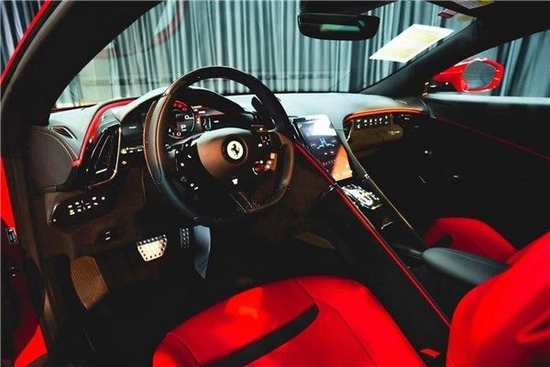 22款法拉利罗马配备了三幅式运动多功能方向盘,并配有全液晶仪表盘、中控触摸屏和副驾驶屏幕。大部分功能集成在屏幕当中,取代了中控的大部分实体按键,中控部分较为简洁。