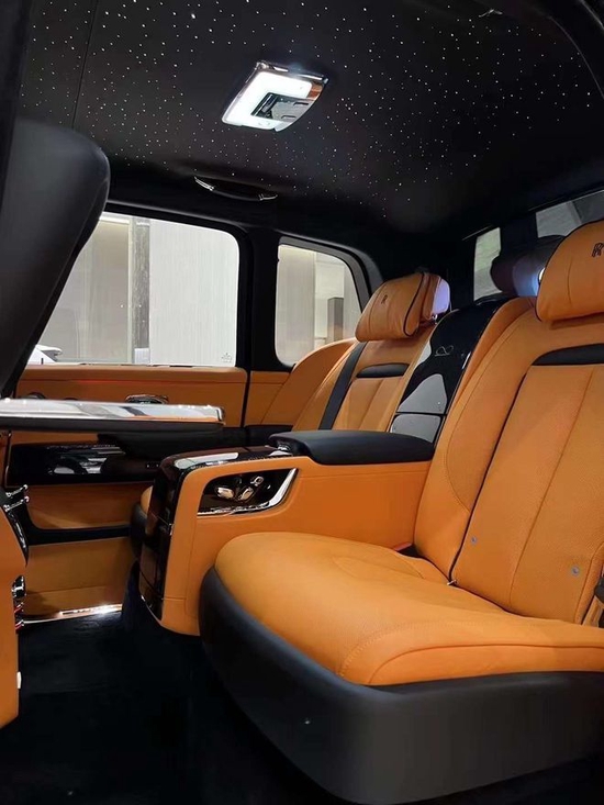 在Black Badge库里南中,奢华真皮座椅上的星空顶,作为新增的柔和光源,强化了车内的氛围。黑色真皮配合1,344根独立光纤手工编织其中,绝妙还原了夜晚的星空。八颗绚丽的白色流星随机地在车顶划过,前排乘客的头顶出现流星的概率更大,十分巧妙地体现出这辆车对喜爱自主驾驶的客户的吸引力。