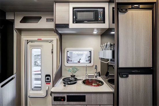 厨房区位于会客厅的对面。配备志高电磁炉及不锈钢洗手池等;上方和下方均设计有多组储物柜,储物空间丰富;周围一组220V电源插座可为手机等小型电器充电。房车旅行最重要的一点就是舒适性,车内宽敞的空间是必不可少的。C530大玩家定制版房车车内空间很大,整体布局很合理,驾驶室、卧室区、客厅、卫生间、厨房等功能区一应俱全。