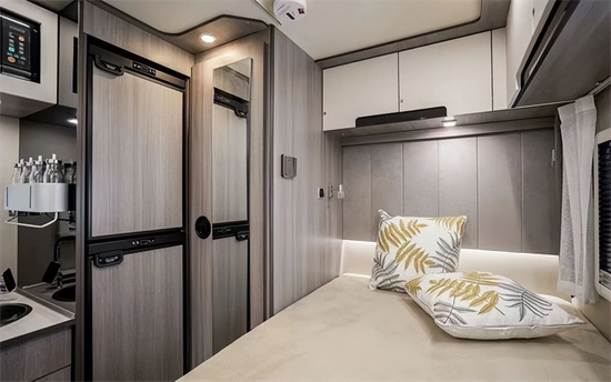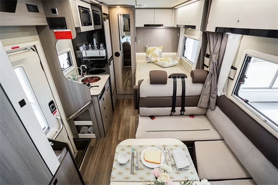 进入车内,科技灰环保板材与米白色内饰搭配,为车内营造出居家般的生活感,空间虽不及拓展房车,但L型卡座会客区、前额头床、中央厨房、后子母床(或者后纵床)及一体式卫生间等生活配置一应俱全,同时整车外推窗均配备有私密拉帘,有效保障旅途中的隐私。