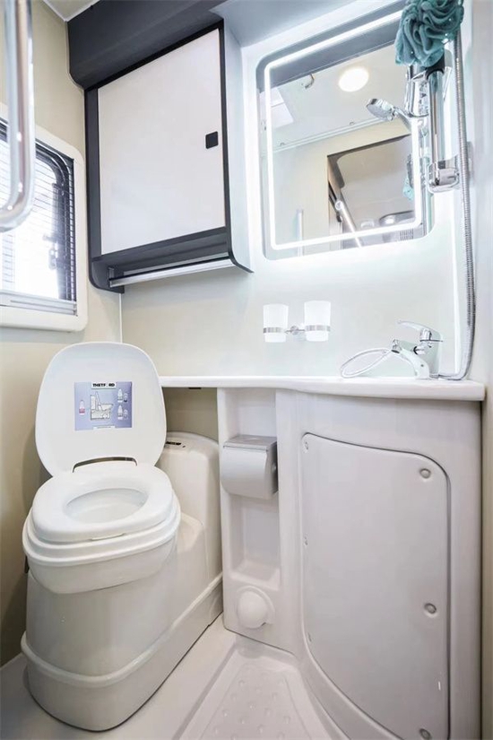 卫生间的空间还是不错的,可以满足一个成年人的正常洗漱。配置也基本齐全,卫生间采用干湿一体式设计,内部配备座便器、梳妆镜、毛巾架、浴室帘及淋浴花洒等。水路系统方面,净水箱容积为180升,灰水箱容积为55升。完全可以满足出行需求。