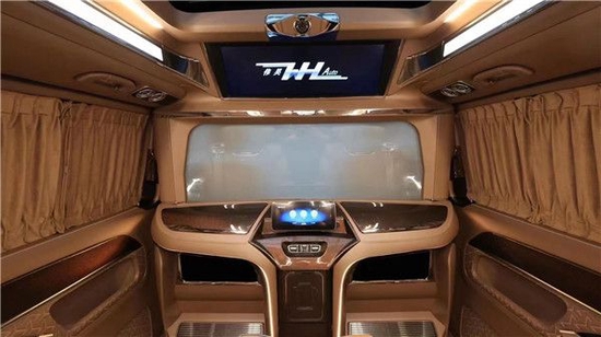 航空座椅带有360度旋转多达14项调节功能(按摩5项、腰托4项、通风、加热、记忆3项、还有7种颜色氛围灯等),以及170°符合人体工程学设计能使您更有效的解除舟车劳顿。是商务车上少有的配置。乘坐舒适性和安全性是同类车型里最高的,车辆配有一个全景天窗,可满足不同乘客使用需求,带有雨量感应等功能,雨天可自动关闭天窗。,触控屏除了可调节座椅还可控制车内顶部灯光、氛围灯、电视、空气净化器以及电动窗帘。后车舱多功能空间,全车皮质手工包覆,仿大理石高级耐磨地板,玫瑰金饰件,顶部29寸宽屏显示器,LED顶灯、环绕灯带;C柱装饰LED壁灯,中门及后排遮光窗帘等等。