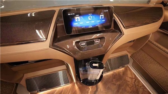 隔断装置由不同的功能组成,分别是顶部无线吸顶电视机,雾化升降的玻璃,以及下方的吧台三部分组成。一来可以保证前后舱相对独立性,保证后舱的私密性;其次如果想要与驾驶舱交流对话,也可以直接升降雾化玻璃。多功能吧台高级皮革包覆,热水壶,两边是柏林之声音响,配合隔断处的大电视,看电视刷综艺,其乐无穷。