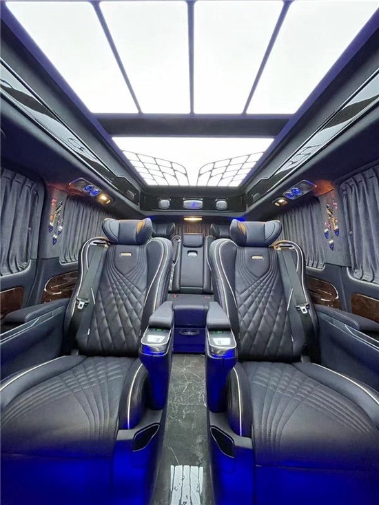 第二排采用真皮打孔的航空头等舱座椅,有着按摩通风加热旋转记忆8项电动调节等功能,搭配贴心设计的舒适头枕,带来更加舒适的出现享受,升级后的奔驰威霆车顶使用迈巴赫工格顶灯和迈巴赫天使之翼顶灯,搭配车内大量氛围的的点缀,带来非常舒适豪华的氛围感。