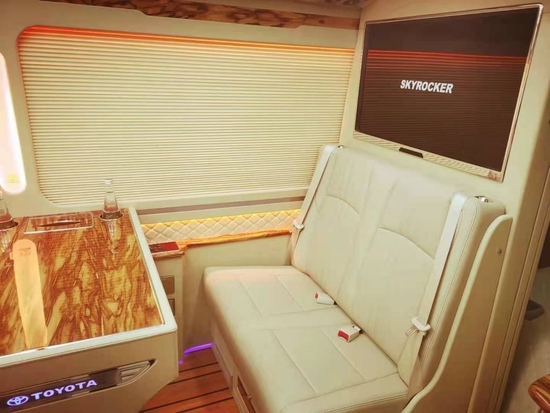 进口丰田考斯特,高级商务大巴,高端领导出行专用座驾,舒适的环境,稳定的性能,低调的气质,是政商界的宠儿。华通丰业优点有:可旋转真皮航空座椅、固定式真皮航空座椅、豪华办公桌、原装进口车载冰箱、加装冰箱外装饰、电动升降窗帘、车载无线传真机、轮毂罩、不锈钢杂物架、钛合金饮料架、秘书台、吸顶折叠电视、电脑视频音频系统、整车地毯、散件地毯、空气净化器、电动台阶、车身彩条等配置。是实现政府、企业领导接待及商务办公、商务旅行的多功能商务车。